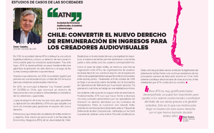 En 2016, la sociedad chilena ATN contribuyó a una victoria legislativa histórica y obtuvo un derecho de remuneración irrenunciable para los creadores audiovisuales. Tras este logro, ATN ha desempeñado un papel fundamental para garantizar la aplicación de este derecho y el pago de las sumas correspondientes a sus miembros.
